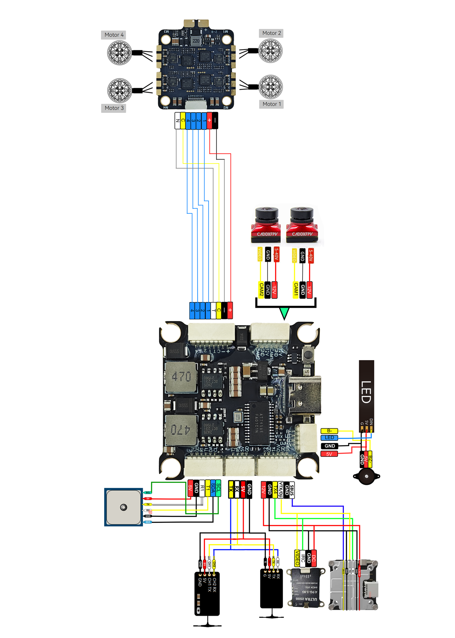 The DAKEFPV F405 supports up to 7 PWM or DShot outputs. The pads for motor output M1 to M6 are provided on both the motor connectors and on separate pads.