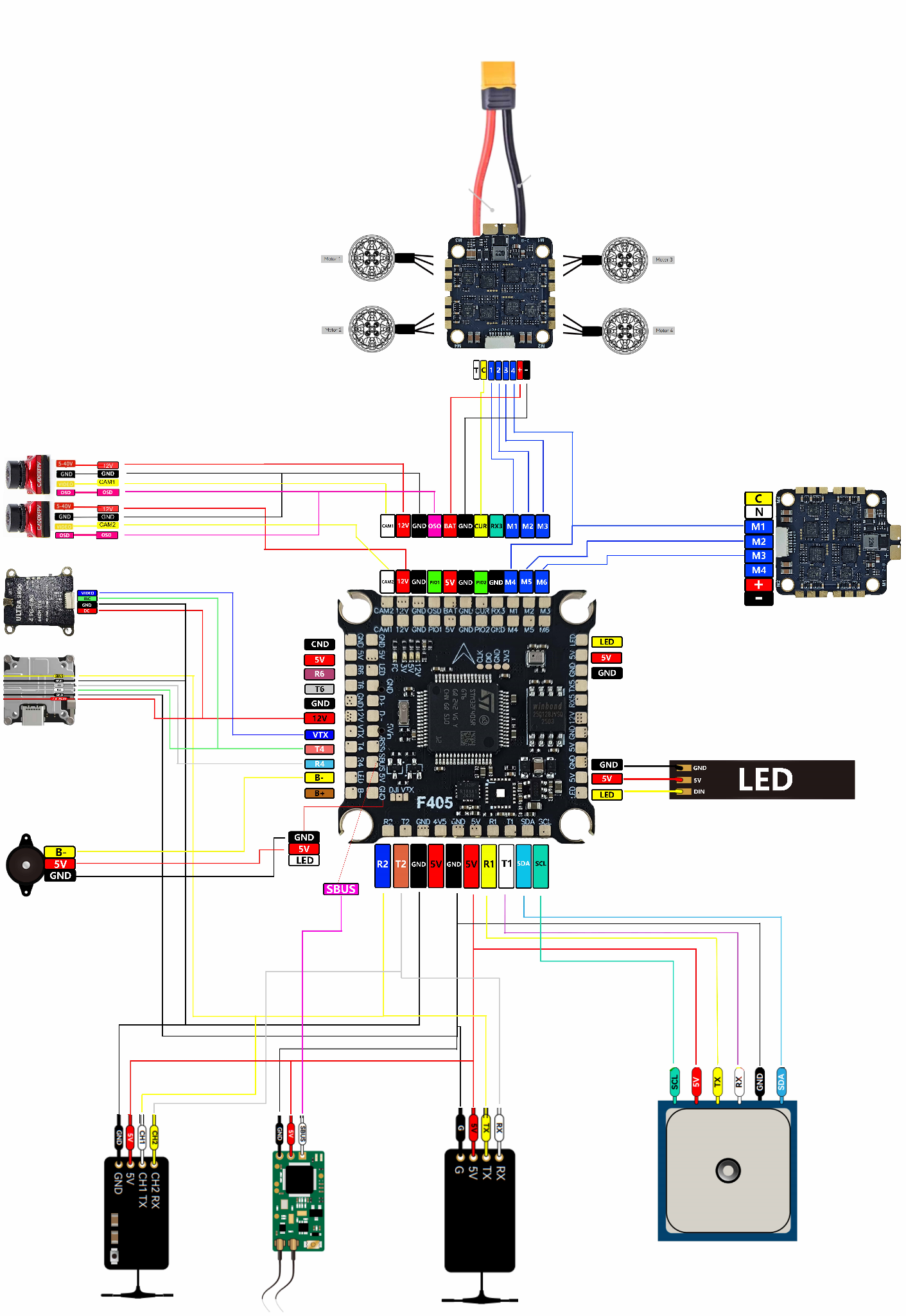 RC input is configured by default via the USART2 RX input. It supports all unidirectional serial RC protocols except PPM and SBUS. The SBUS pin is inverted and applied to R2 for SBUS support.