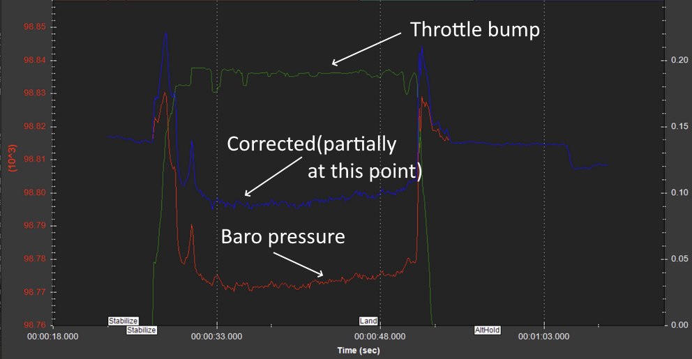 The first barometer (BARO1) can have compensation applied as a linearly varying offset of throttle value to reduce this effect. The BARO1_THST_SCALE parameters determines the magnitude, and sign, of the offset and will need to be experimentally determined for a particular vehicle. Examining the the log messages for BARO1.Press vs BARO1.CPress (compensated atmospheric pressure) can be used for this.