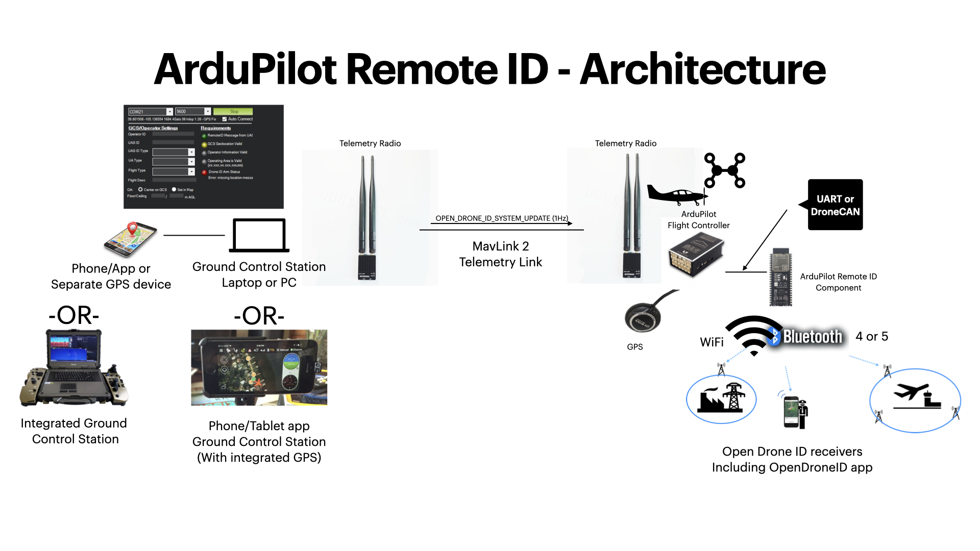 For the ones users will be adding, there are variations on whether the device gets GPS position information via an integrated GPS or from the autopilot using its position and other information for its GPS. If connected to the autopilot for position and other information via MAVLink, either proprietary firmware or firmware conforming to the OpenDroneID standard is used to implement Remote ID(see following section) can be used. Power can be supplied either from the vehicle (MAVLink connection or to the vehicle’s power), or via a small rechargeable battery (completely self contained units which can be transferred between vehicles easily).