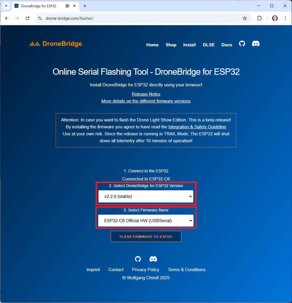 Open a web browser and connect to the online flashing tool at drone-bridge.com/flasher