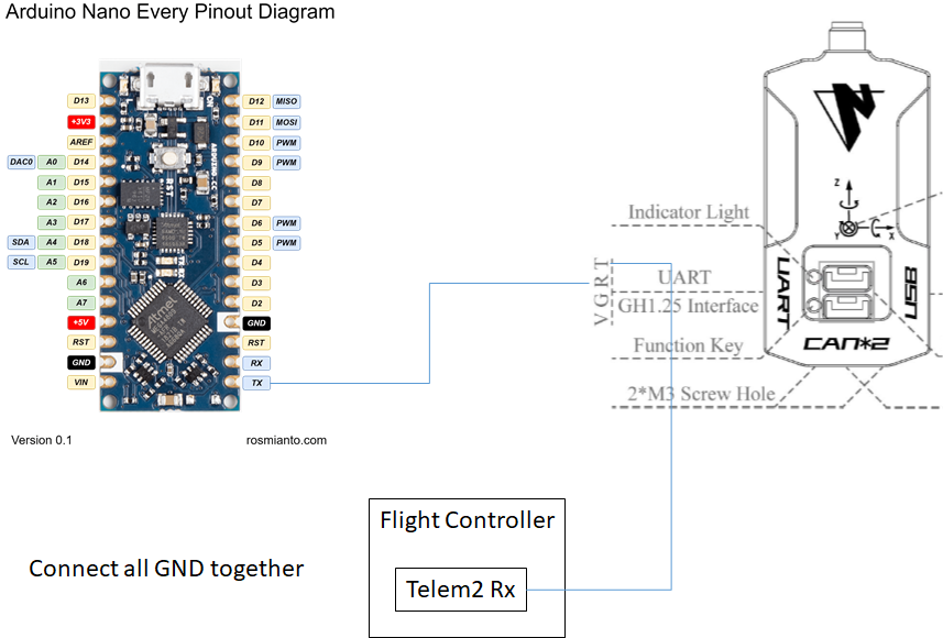 It is possible to directly connect UART port of the tag to the FC. However, UART Tx of certain FCs is not compatible with Nooploop UART Rx (According to developers at Nooploop, it seems to be caused by a CP2012 inside Nooploop nodes. It is possible that this problem can be solved by removing this CP2012). It causes the FC to be unable to communicate with the tag. Pixhawk 4 mini and Kakute F7 are confirmed to have this issue. In this case, an Arduino Nano Every can be used as a work-around. Use Ardnio IDE to upload Nooploop work-around sketch to a Arduino Nano Every and connect its UART Tx to UART Rx of the tag. For the following we assume that the tag is connected to the FC’s UART port corresponding to SERIAL1.