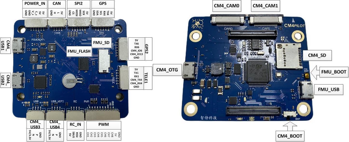 5x UARTs/serial for GPS and other peripherals, one normally used for RC input, one for CM4 connection